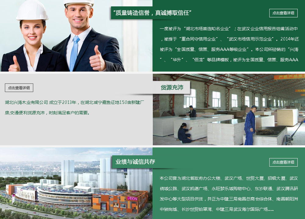 湖北興濤木業(yè)有限公司成立于2013年,在湖北咸寧嘉魚征地150畝新建廠房,公司立足于武漢地區(qū),業(yè)務(wù)輻射湖北及周邊地區(qū),多年來致力于木枋、模板批發(fā)業(yè)務(wù),公司以“質(zhì)量鑄造信譽(yù),真誠搏取信任”為宗旨,以多品種、低價格、優(yōu)質(zhì)量深受廣大客戶的青睞,是一家在木枋模板行業(yè)中處于優(yōu)秀地位的廠家。公司一度被評為“湖北市場知名企業(yè)”;在武漢企業(yè)信用報告組編活動中,被授于“重合同守信用企業(yè)”、“武漢市場信用示范企業(yè)”。2014年還被評為“全國質(zhì)量、信譽(yù)、服務(wù)AAA等級企業(yè)”。本公司所經(jīng)銷的“興濤”、“華升”“佰龍”等品牌模板,被評為全國質(zhì)量、信譽(yù)、服務(wù)AAA等級品牌模板。